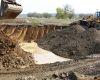 Links wordt de dekgrond verwijderd en het ontstane gat wordt gevuld met toutvenant van elders om een stabiele ondergrond te krijgen. In de verte ziet u het gehucht Herbricht aan de overzijde van de Maas.