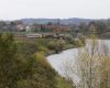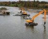 Voorraad basaltstenen waarmee het stortebed achter de stuw wordt gemaakt.